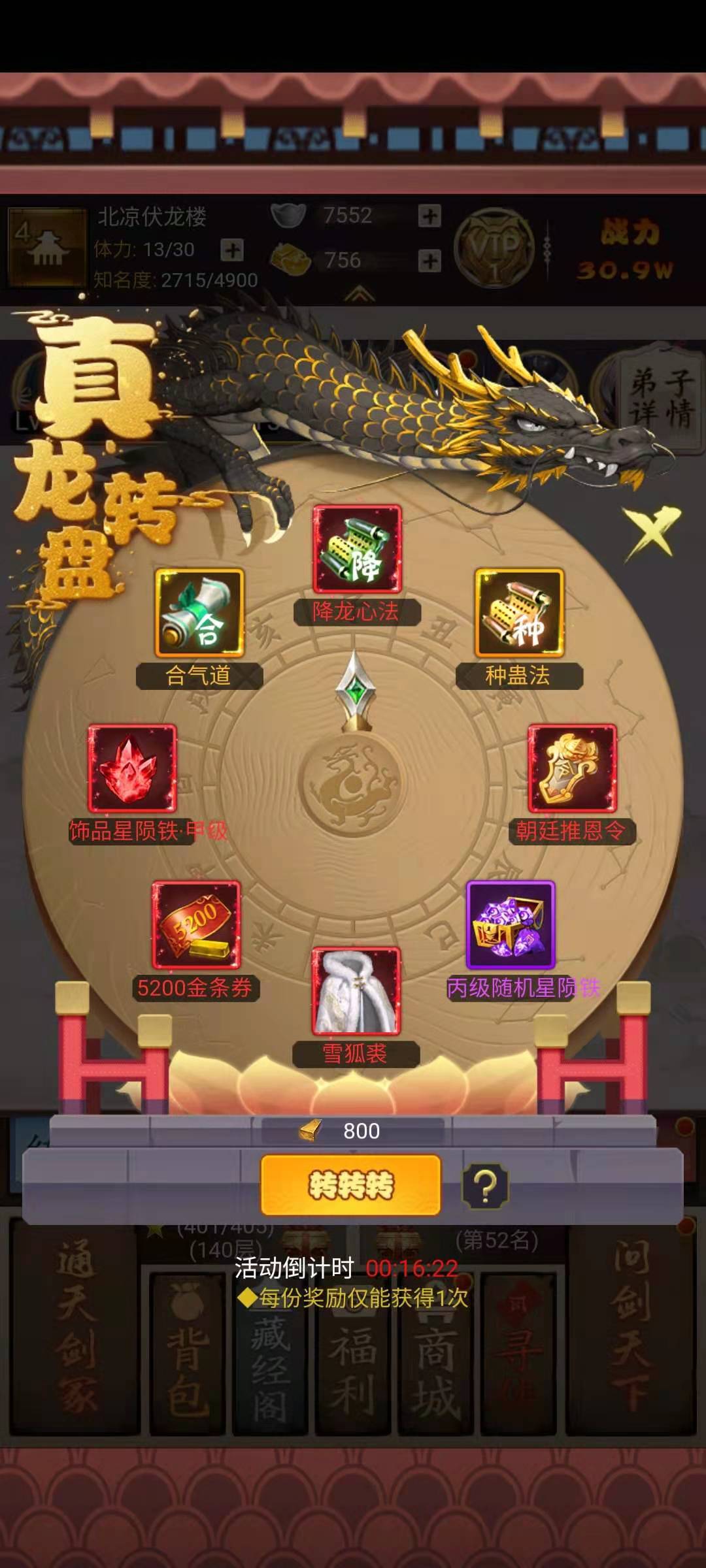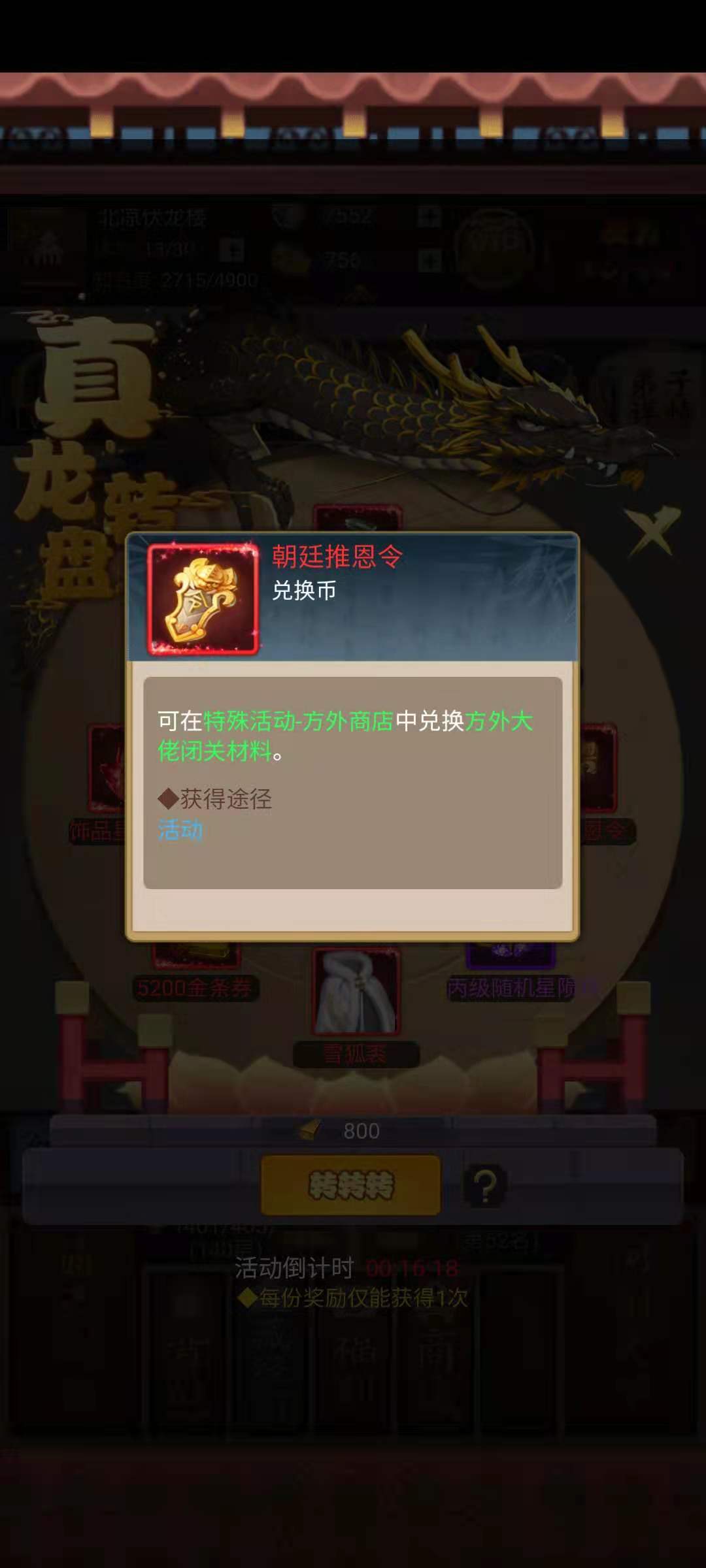 玩家需要使用特殊活动道具朝廷推恩令来在方外商店中兑换到天道石碑,朝廷推恩令是在节日活动的真龙转盘中抽奖得到的,800根金条才能抽奖一次,一般来说抽个8次就必定能获得朝廷推恩令了。兑换到天道石碑之后可以给闭关十重的弟子直接完成闭关,也可以供其他弟子观摩,观摩一次课恶意提升百万战力,非常强力。