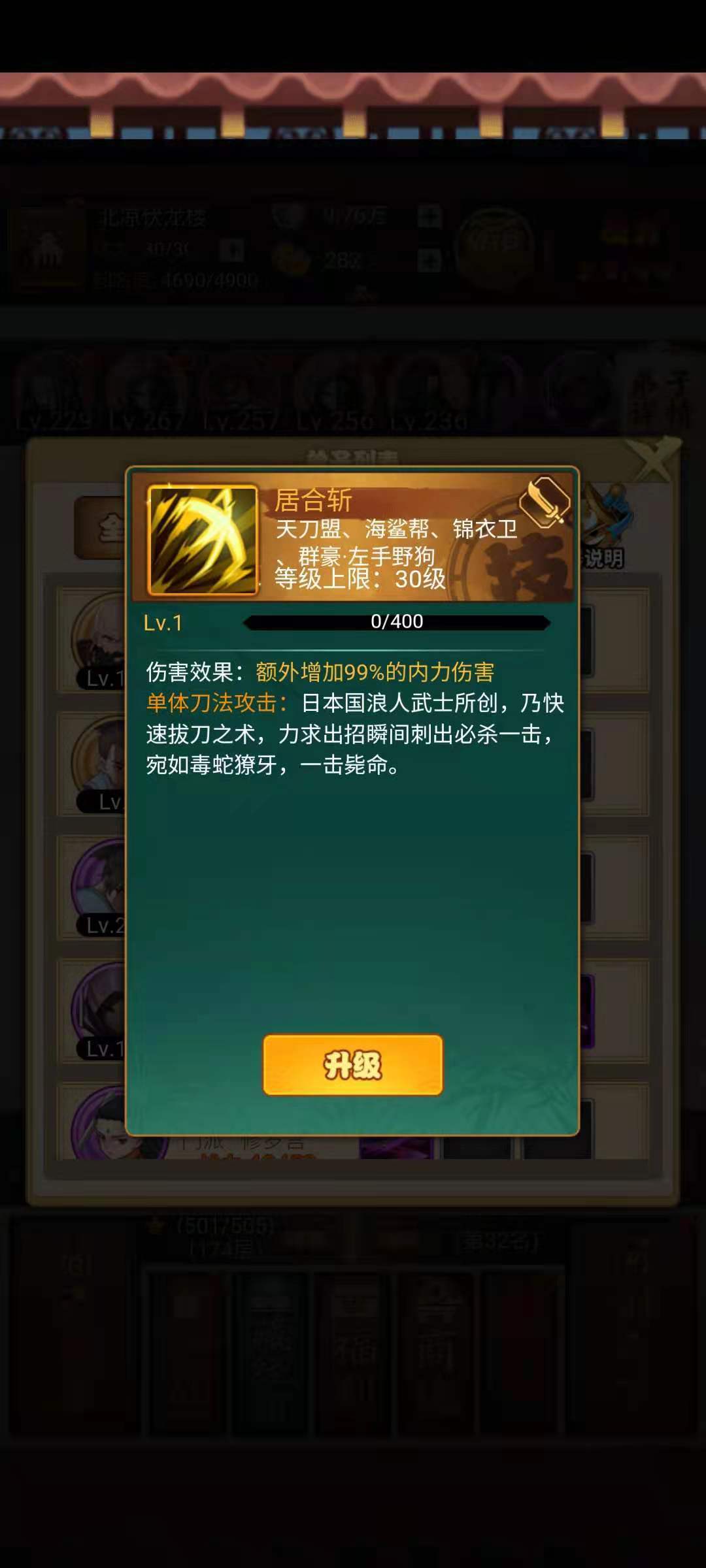 其余的弟子也都是这两个技能是最主要的,除了合气道和居合斩外,剩余的一个位置一般选择的是斩杀这个技能,斩杀效果是增加55%的内力伤害,虽然不如居合斩伤害高,但是比普通攻击要强多了,所以这也是一个不错的备用技能。