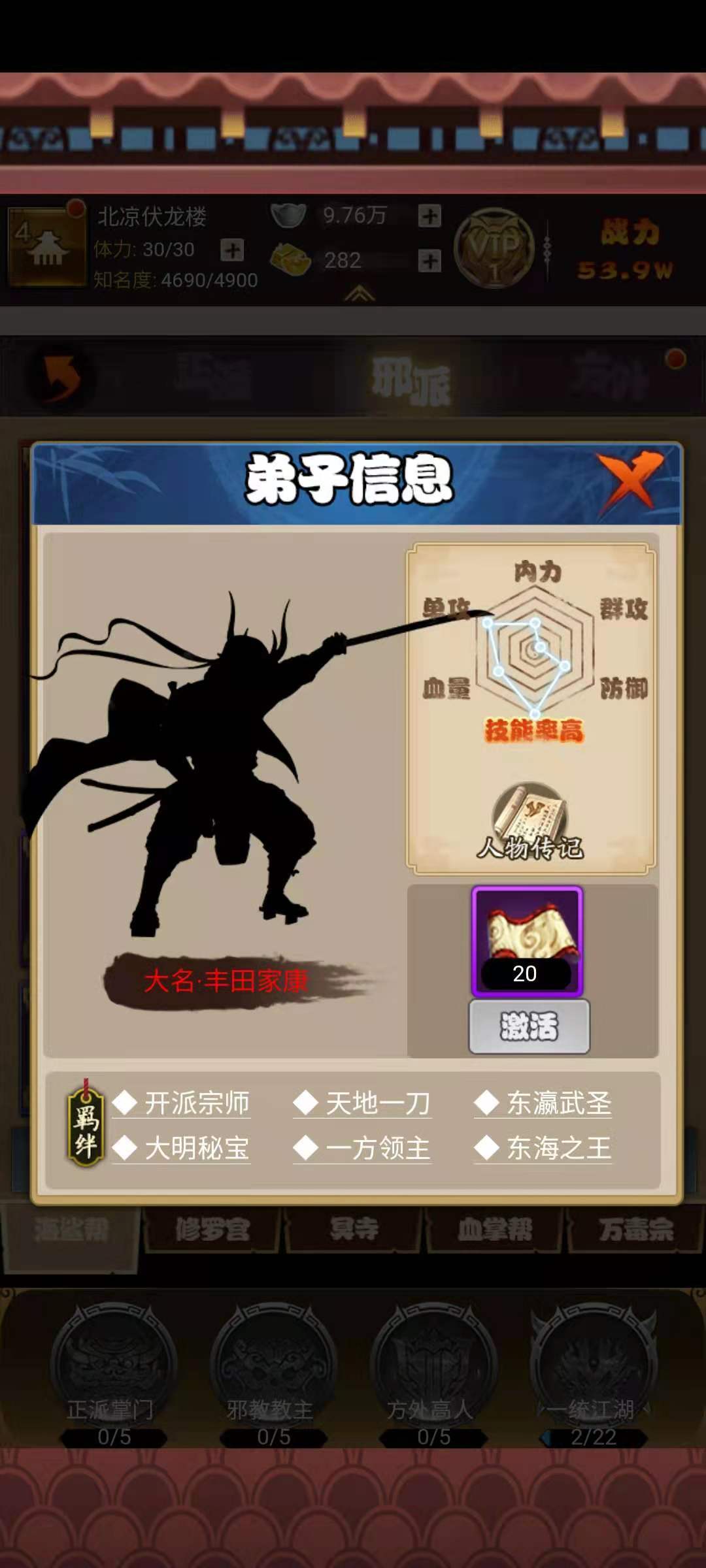 大名-丰田家康是甲级高手,也是所有的高手中用刀攻击最高的一个,但是目前的强度不是很理想,大约在第二梯队到第三梯队之间的位置。这也是因为技能限制的太离谱的缘故,大名-丰田家康一般搭配的技能招式是居合斩,内功心法是合气道。其中居合斩可以增加99%的内功伤害,合气道可以增加内力值,但是居合斩的伤害还是低了一些,不过也没有更好的选择了。
