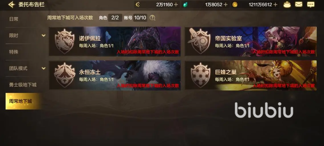 3月26日更新后,玩家可以看到委托页面新增4个周常地下城,每个角色每周最多可进入其中2个,也就是4选2。全账号一共可以入场10次,每个地下城每个角色限挑战1次。
