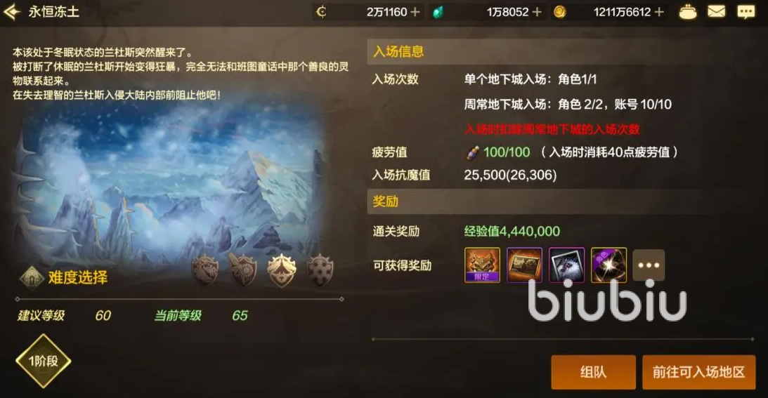 入场时会固定消耗40点疲劳,如果疲劳不足则无法进入(可交易限制疲劳不消耗,疲劳值燃烧效果也不适用)。副本难度适中,所有副本都是2个小怪房间加1个BOSS房间的模式。各地下城的入场抗魔值要求依次是:诺伊佩拉16000、帝国实验室21500、永恒冻土25500、巨蜂之巢31000。