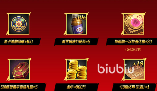当版本7月23号上线后,首先要与大家见面的是一个送礼活动,在活动期间玩家只需要在指定时间登陆游戏,那就可以领取到一张加18的武器强化卷、100个斯卡迪印章、5个30点的疲劳药、20个一次性强化、800万的金币和5个五阶颜色徽章自选礼盒。