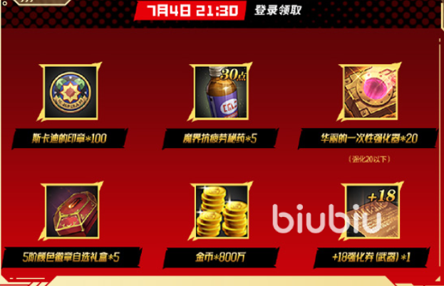 首先有四个部分的福利,四部分的福利分别会在7.4、7.9、7.13、7.23陆续开放,基本上是登录就能领取的,会有例如武器强化券,印章,疲劳药,强化器,金币,以及装扮等等,福利非常的丰厚。