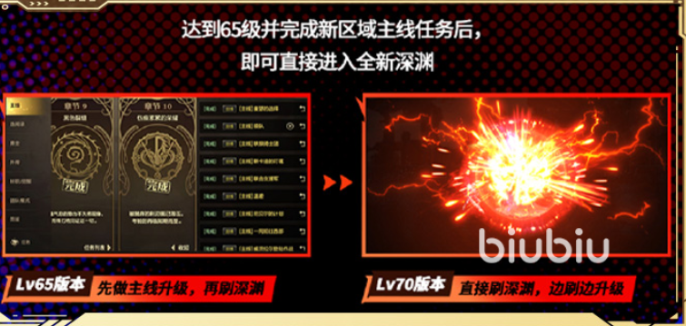 升级内容进行了调整,65级将新区域主线完成,可进入全新深渊地下城,享受一边刷装备一边升级;深渊地下城的视觉表现升级,“暴走研究所”单次消耗5点疲劳,地图精简为1个房间;“塔尔坦炼器所”入场门票无法交易,可通过深渊地下城,团本,日常活跃行为获取,入场不需要疲劳值,还能指定特定部位提高掉落率。