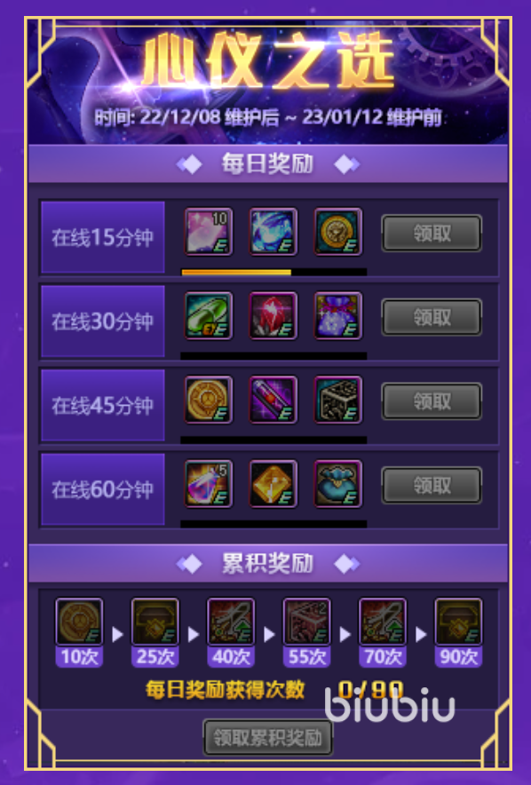 另外,在活动持续时间2022年到12月8号到2023年1月12日维护之前,游戏内会开放新一只选的特别三选一大礼包。基本上每个人活动期间,只要在线达到相应的时间标准,也就是最多一个小时就可以在三种好礼中,选择一个作为自己的登录奖励。另外,累计领取的次数达到一定批次之后,还有额外的特别大奖。
