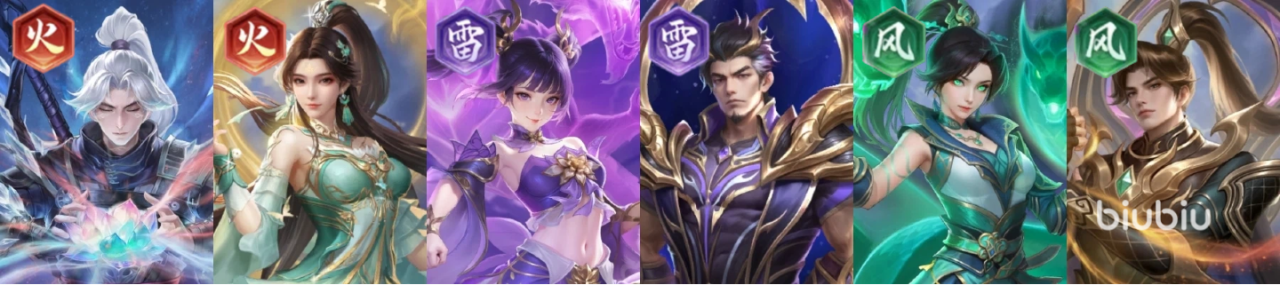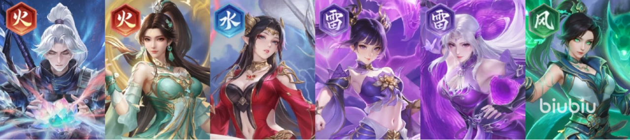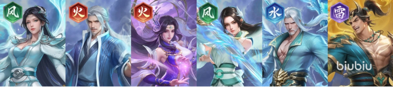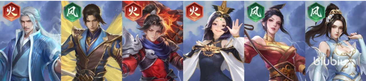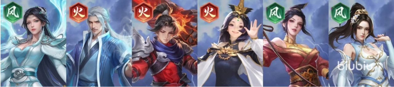 推荐理由:开荒收割队的进阶版,云韵与林修崖一样有着击杀再动的能力,但在单卡强度上云韵要比林修崖强上不少。其他的火、风系角色依旧主要提供羁绊加成触发双源争锋组队buff。本阵容可轻松打到第六章以上。