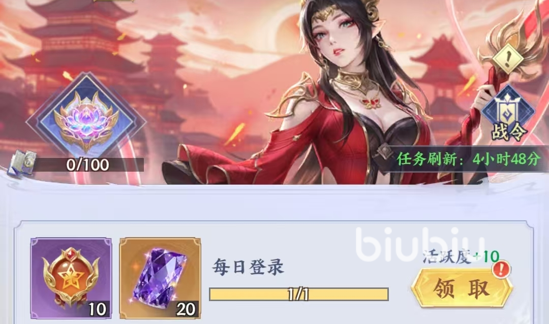 主角等级10级时解锁,完成每日日常任务可获得【活跃点】、【金币】、【紫晶卡】及各种养成资源,【活跃点】达到100后,可领取【征召玉兆】。