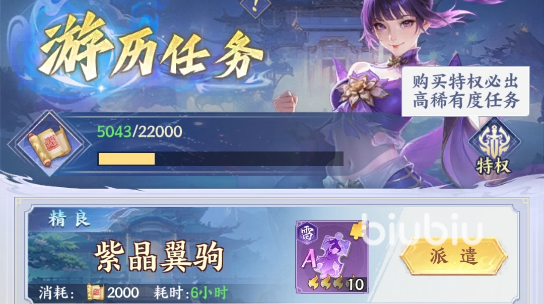 随新手指引任务解锁,派遣斗者完成任务可拿到【金币】、【紫晶卡】、不同品阶的【斗者碎片】等奖励,每次派遣都会消耗一定数量的【游历值】。购买游历特权后,会获得刷新必出紫色任务的权益。