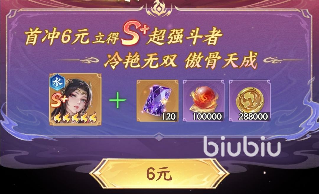 首充6元,能立刻拿到很好用的S+角色【美杜莎】,还有120张【紫晶卡】以及大量【斗者经验】和【金币】。