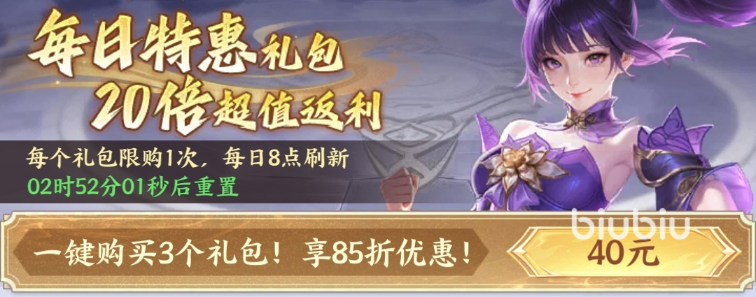 共有1个免费礼包和3个付费礼包,一次购买完3个付费礼包可享受85折,折后价为40元,每天8点刷新可购买次数。