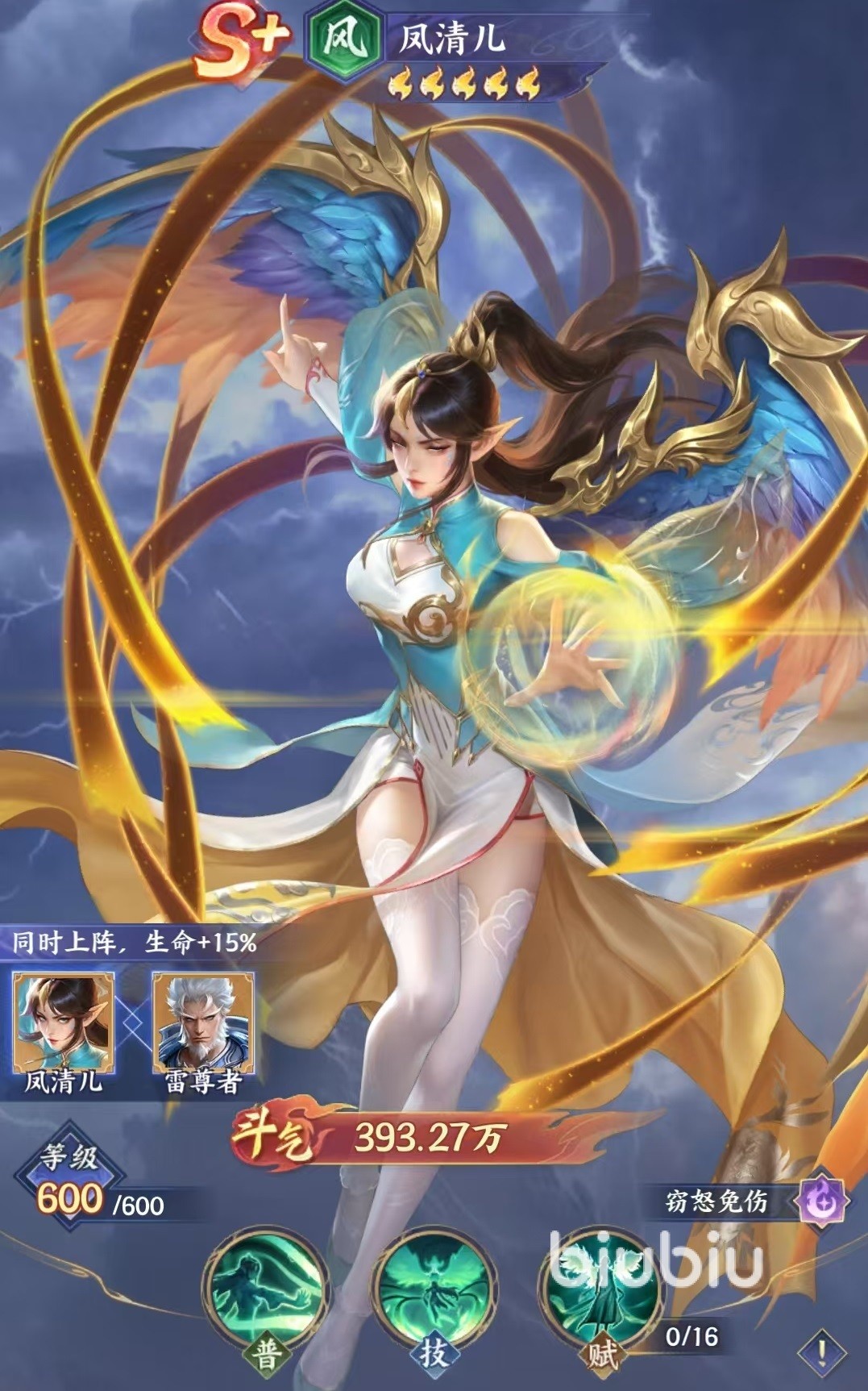技能可攻击对方后排造成伤害,有几率窃取对方身上的一点怒气,偷怒气是很有用的技能效果,这样不仅可以限制对方使用技能,更可以加快自己的技能输出循环。红色四星时释放技能后,可为我方生命值最低的斗者附加两回合无敌盾,只有要在无敌盾的保护下就不会死亡。白金一星时,窃取的怒气值可恢复给己方和友方攻击最高的目标。白金三星时释放技能后,有几率给己方攻击最高的斗者增加怒气,这样不仅加快了自身的技能循环,还可以提升主c循环,对团队的输出是有效加成。粉彩一星时,当凤青儿释放技能后,雷尊者立即出手一次。所以阵容中只要使用凤清儿,那么一定要出现雷尊者,不然就浪费了最佳的效果。