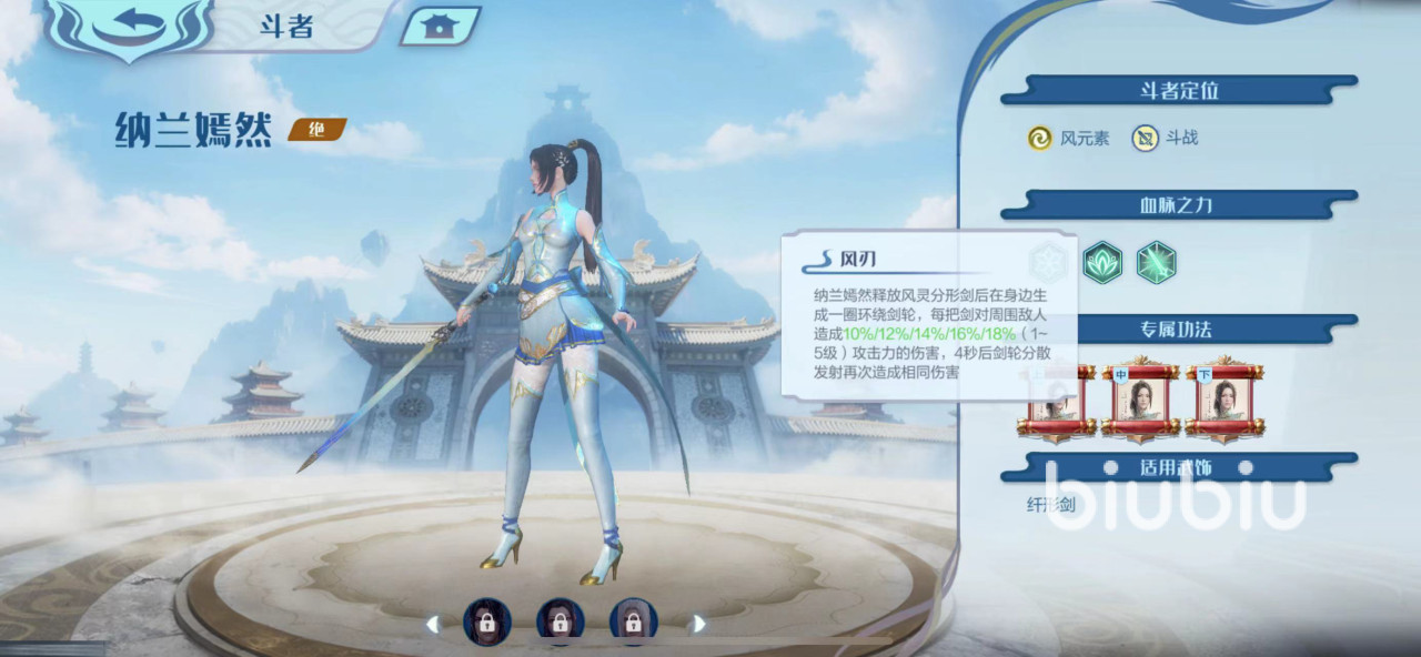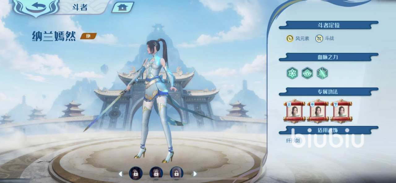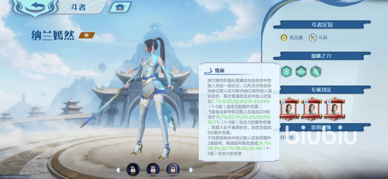 纳兰嫣然的定位是斗战,并且作为一个橙色英雄。拥有良好的成长属性,主要攻击手段为风属性技能。此外她的外貌非常优雅美丽,有着英姿飒爽的身姿以及高挑的身材。就算在战斗中,也能欣赏她美丽的形象,让人心中无比愉悦。
