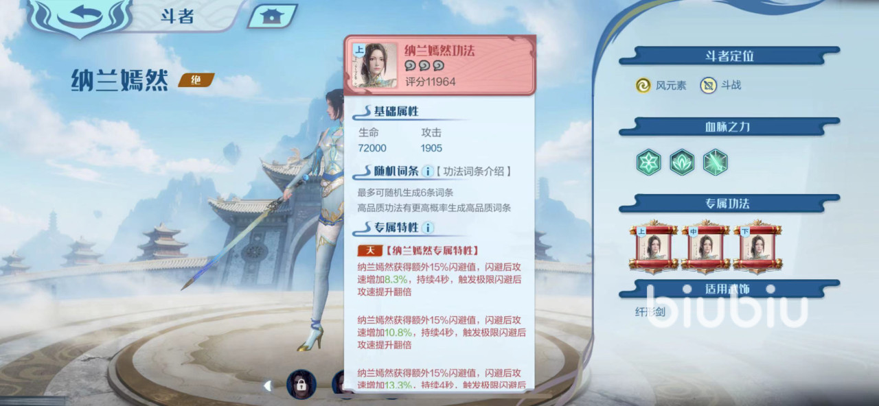 另外,纳兰嫣然的专属功法,可以让她提升大量的生命值以及攻击力。并且可以随机洗出六种词条,属性大家可以尽量的洗出攻击力、暴击率以及攻速等增加输出的词条。然后还可以带来特殊效果,可以不断地提升闪避率。当你成功闪避敌人的技能时,就能够获得高额的攻速加成,让你瞬间可以打出多发普通攻击,造成狂风骤雨般的高额伤害。