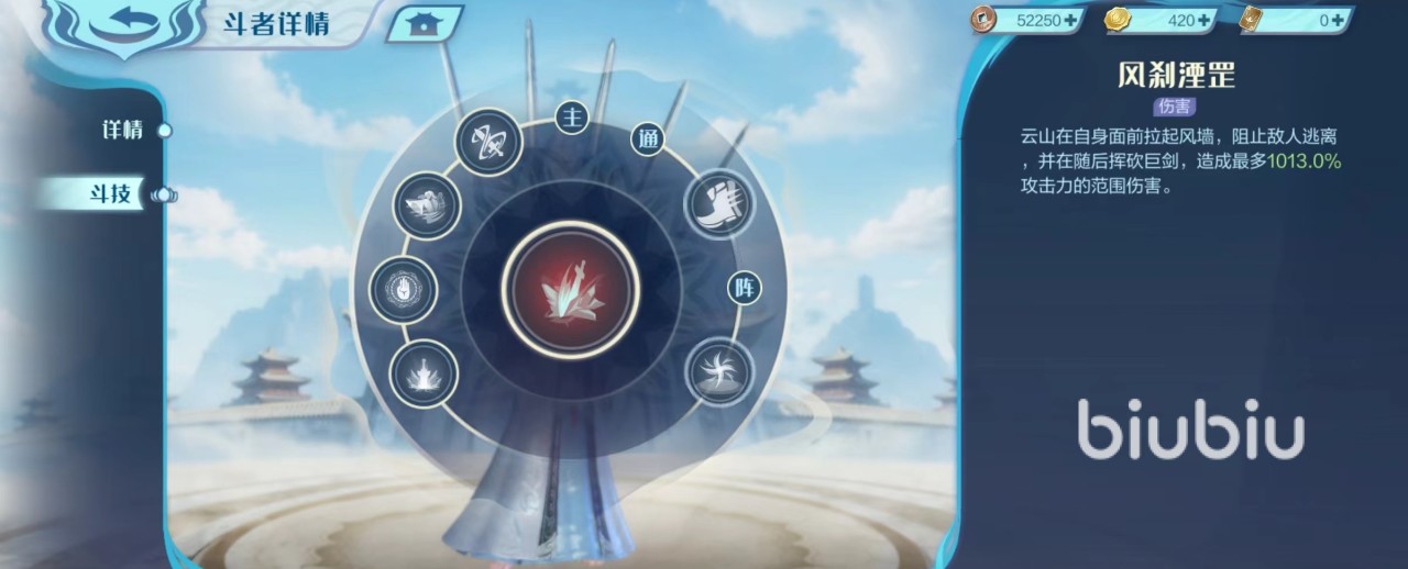 云山的斗技效果就和它的外形一样非常霸道,最主要的技能是风刹湮罡,在前面拉起风墙,阻止敌人逃离,随后挥砍巨剑造成一次非常恐怖的范围伤害,在清理数量众多的小怪时,该技能可以发挥出极强效果。招式聚剑诀,在面前召唤巨剑从天而降,随后引爆造成范围伤害。招式大荒手印,在自身两侧召唤出两个分身,分身向前方冲刺,遇到精英敌人时使用手刃造成伤害,之后云山释放大荒手印,对面前敌人造成伤害。
