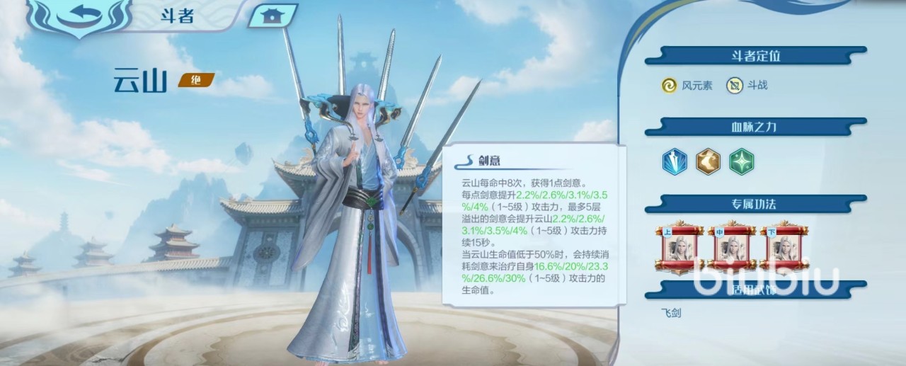 接下来介绍一下云山的血脉之力,作为橙色品质角色,拥有三个很强的血脉之力。第1个剑意,命中8次就能获得一点,血量过低时可以消耗剑意来治疗自身,剑意还可以提升攻击力的数值。第2个闪烁,聚剑诀如果没有暴击,会提升接下来的暴击率。第3个宗师之力,对伤害到自己的敌人施加猖狂标记。