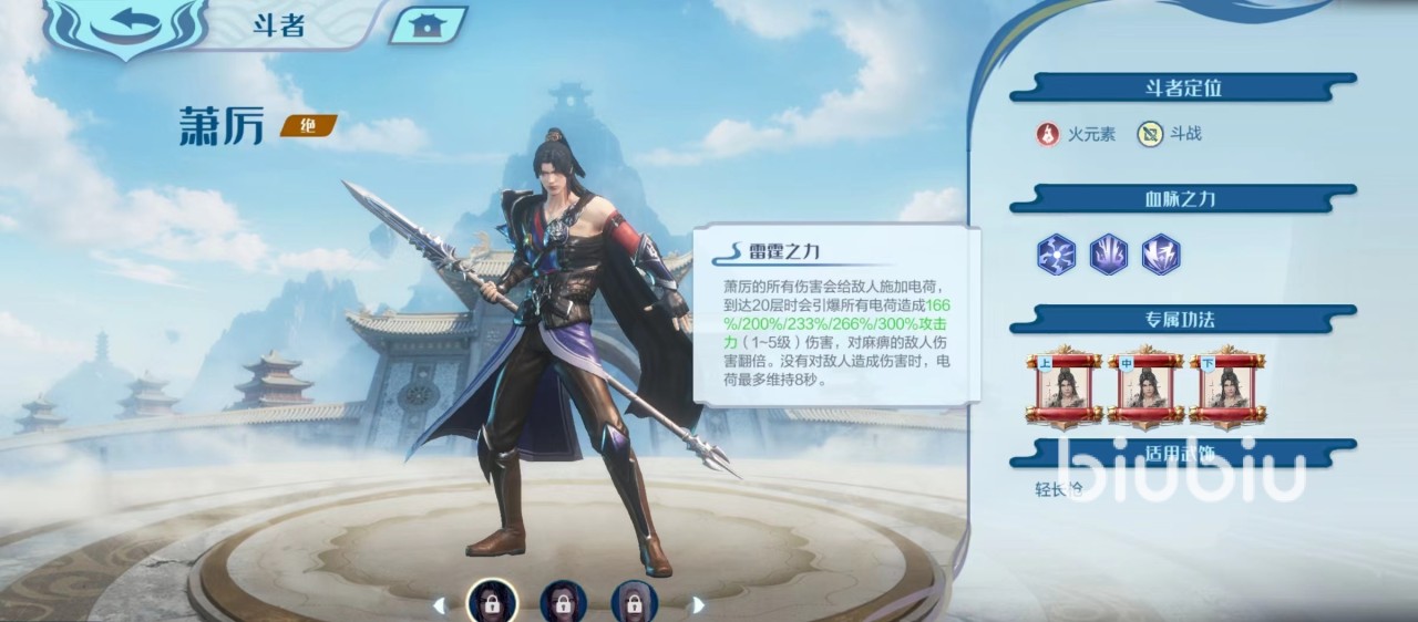 萧厉的这些招式都是很强势的输出,而且伴随着减速和挑飞等各种控制限制效果,这在pk过程中是非常有优势的。使用时候也没有太多操作技巧,大多数技能都有很明确施法方向和伤害范围,只要能按部就班将斗技甩出去就是成功。作为橙色品质斗者,萧厉还具有三个血脉之力。第1个雷霆之力,所有伤害都会给敌人附加电荷,电荷层次达到20层时,将所有层数引爆造成伤害,如果敌人正在被麻痹,则伤害翻倍,电荷最多维持8秒钟。