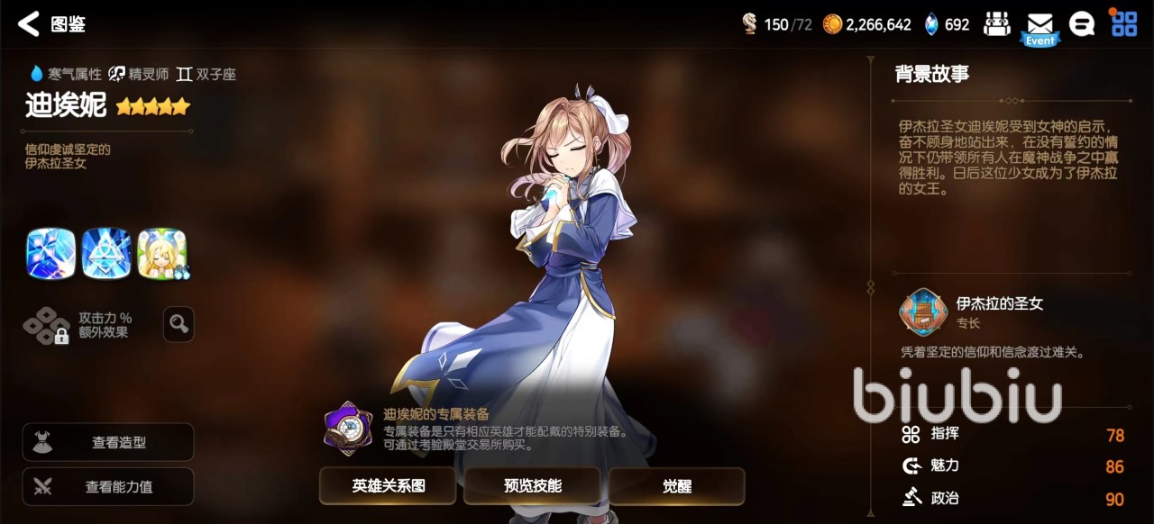 大家从中可以得知这个定位奶妈的角色,技能上完全没有回复,所以可以携带治疗类型的神器,孤挺花之杖就是比较不错的,加上迪埃妮自身的速度,高频率出手行动可以多次触发治疗效果;其次是不凋零的回忆,是群体治疗类型的神器,同样适用;因为迪埃妮的行动条跟速度都很快,也可以带飙车书这件神器,把她多动症的优势再提升一个层次,各种增益BUFF释放更加频繁。