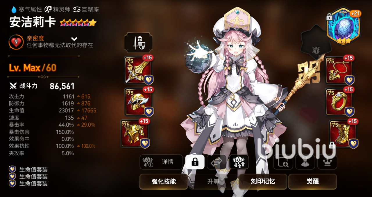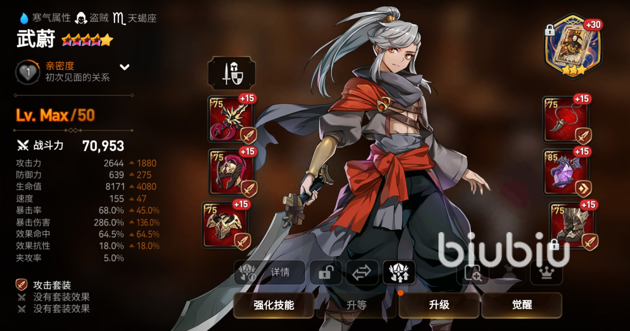 3、装备属性:该角色对装备的需求不高,带上普通的速度速度套就行了。神器方面推荐“穿星辰之歌”,带上后效果十分显著。属性要求为,攻击力随意、防御力随意、生命值随意、速度180+、暴击伤害随意,效果命中70+,只对速度和命中有要求。
