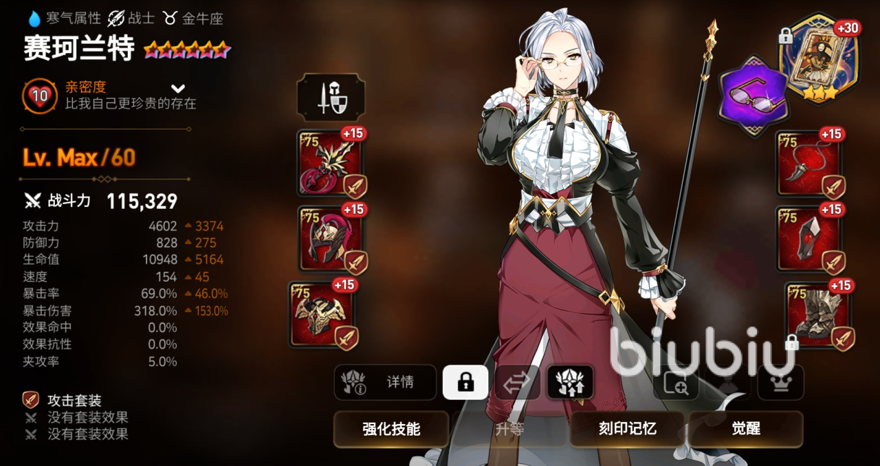 3、装备属性:全部带攻击套装即可。属性要求为,攻击力2500+、防御力随意、生命值8000+、速度150+、暴击伤害280+,效果命中65+。需要尽可能放的提升一些输出,为了加快过关难度速度。同时要记得叠上一些命中,为了更好的触发被动。