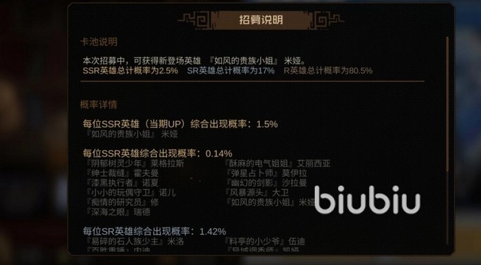 卡池介绍中有提到SSR角色的总计概率是2.5%,这个和很多游戏抽卡概率是差不多的。SR概率是17%,R的概率是80.5%。每个当期up的SSR角色综合出货率是1.5%,而每个SSR角色综合出席那概率是0.14%。