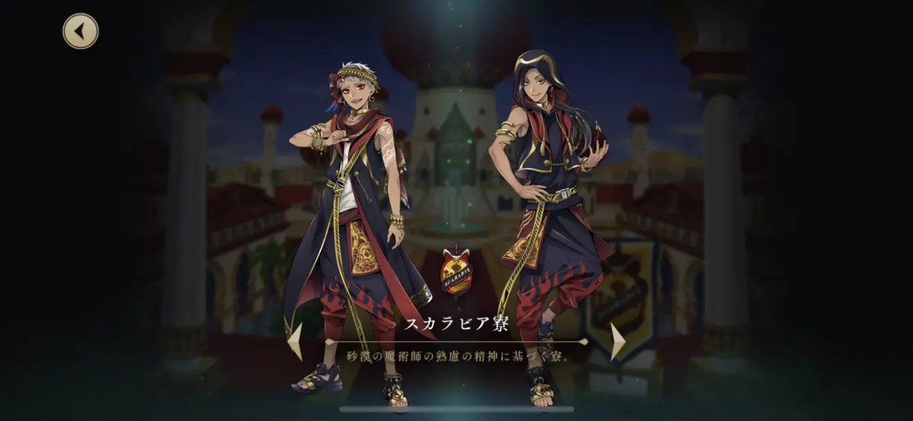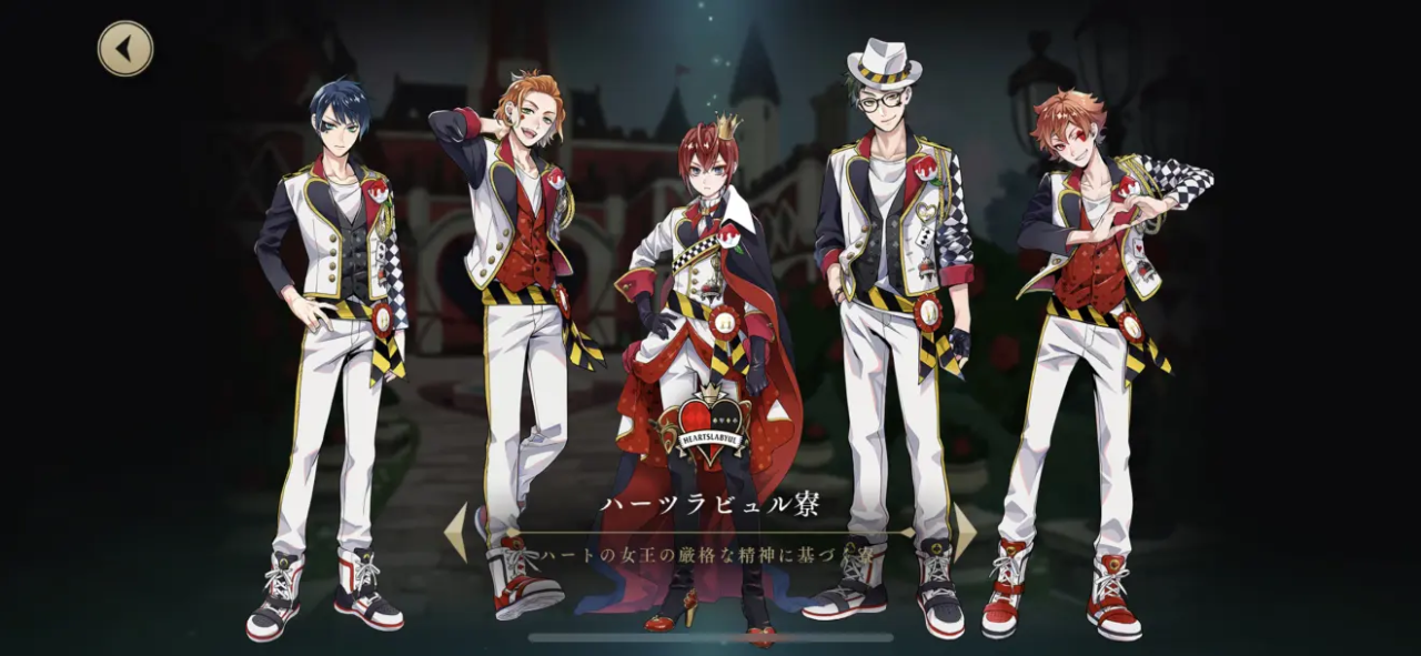 首先我们进入游戏之后全部都是日语,看不懂没关系一直点就行了,到了选择寮和人物这里停下就行了。这款游戏中一共有七个寮,分别是游戏中七杰所控制的七个宿舍,这七杰其实也就是迪士尼中非常经典的七个反派,大家有兴趣的可以自己去搜一下。那么我们首先来选择寮,这七个寮选择好之后就要选人物了,每个寮里面都至少有两个人物,这让小伙伴们很难选择。