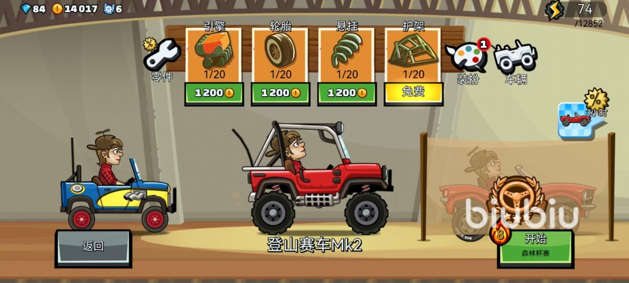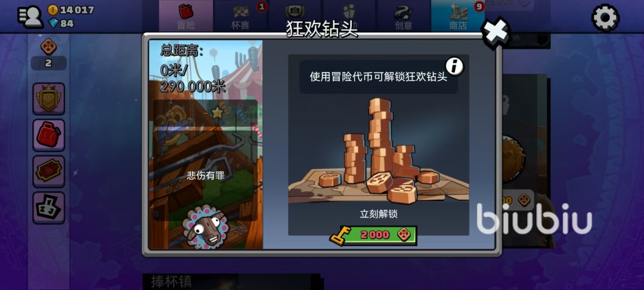这张地图是需要大家完成任务后才能够解锁的地图类型,选到冒险模式后,在冒险模式中就可以看到,狂欢钻头还是属于比较高端的一个,需要2000点冒险代币才可以解锁。冒险代币是在箱子中收集到的,解锁完毕后就可以选择此地图来进行冒险。在进行冒险之前,首先要根据地形对自己赛车进行一番升级。因为地图中起伏比较大,所以悬挂和轮胎以及护架都非常关键,引擎反而不是最关键道具。