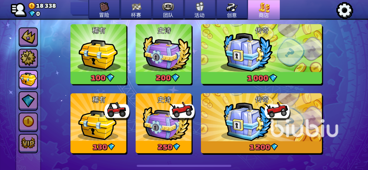 完成每一项比赛和挑战任务之后,就可以直接获得蓝色品质的免费宝箱,也可以通过观看视频广告来打开超级宝箱,开通了月VIP的玩家也可以开启专属的VIP宝箱;当然也有直接消费钻石来开启了稀有史诗传奇宝箱等等,全部都有一定的概率获取史诗级别皮肤外观。