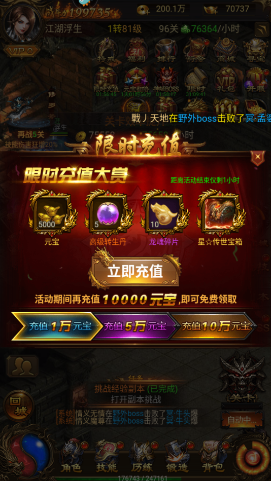 3、活动BOSS:活动BOSS分为攻城和世界两种,只要大家参与就有奖励。