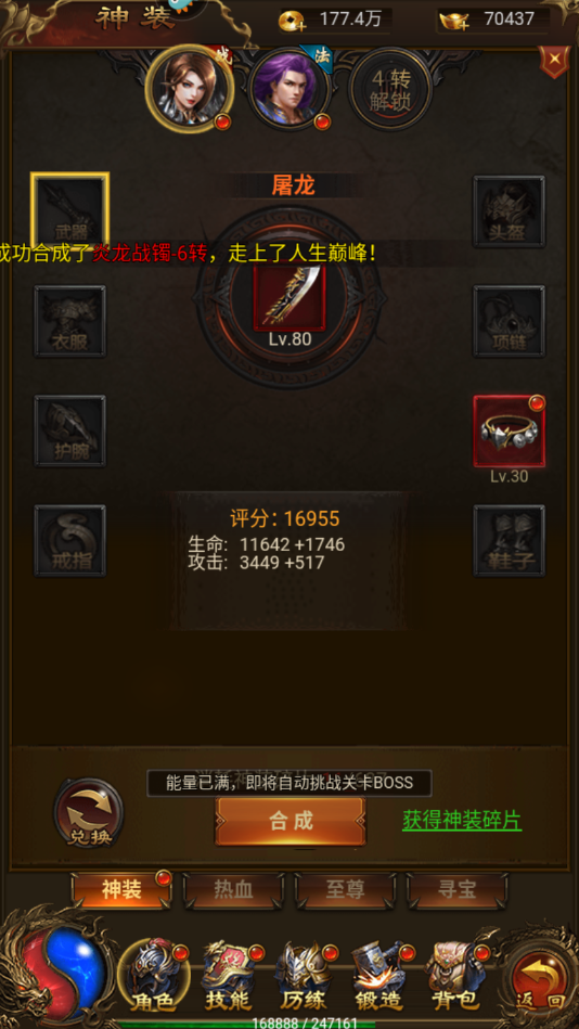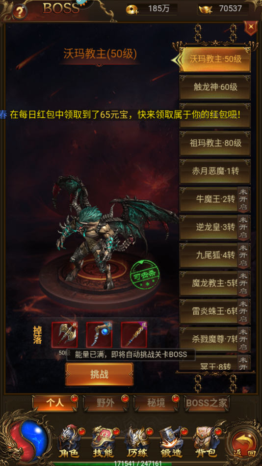 (3)个人BOSS:个人BOSS是专门获取神装的地方,和其他方式相比这个获取几率是最高的,不过个人BOSS是有次数限制的,在第二天的凌晨会才会刷新。