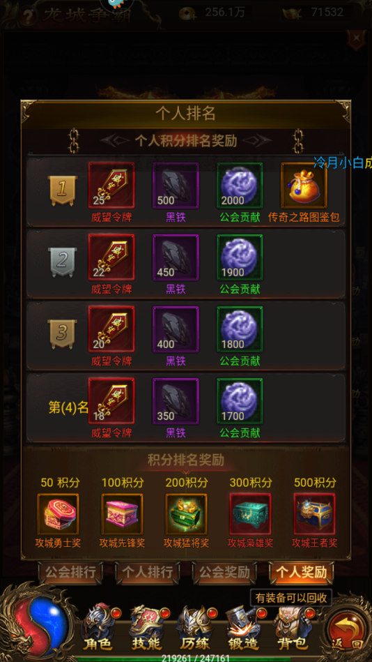 1、50积分:攻城勇士奖,威望令x5,黑铁x50,帮贡x100。
