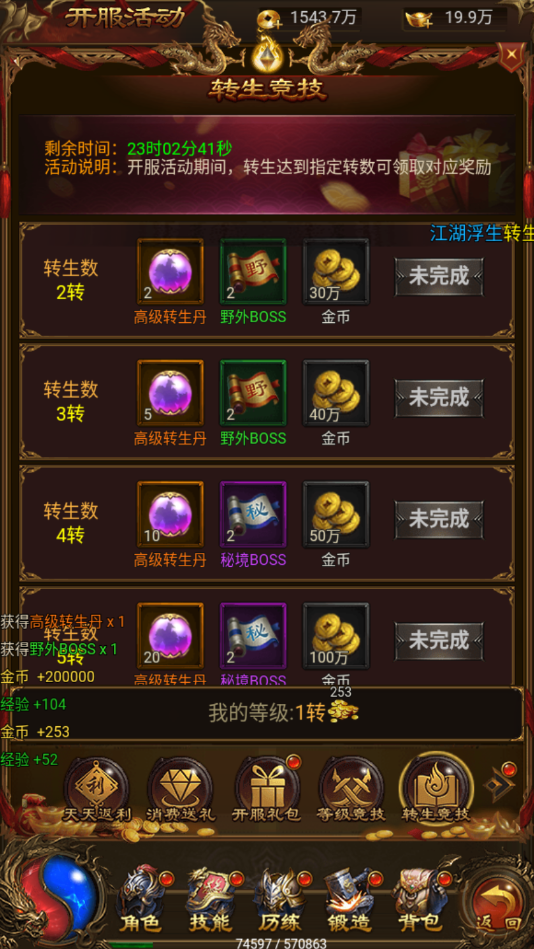4、开服奖励:这款游戏开服的奖励非常的多,即使大家没有用心玩游戏也是能够得到大量转生丹的。