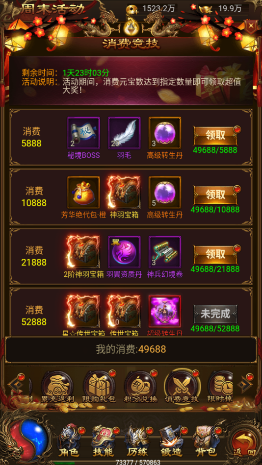 2、活动获取:“高级转生丹”和“超级转生丹”作为重要的转生道具,即使大家不花元宝也是可以通过活动奖励获取的,大家多关注下活动。