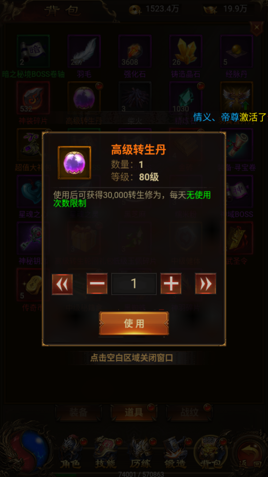 2、无论是以哪种方式获取的高级转生丹,每天最多只能使用10个。