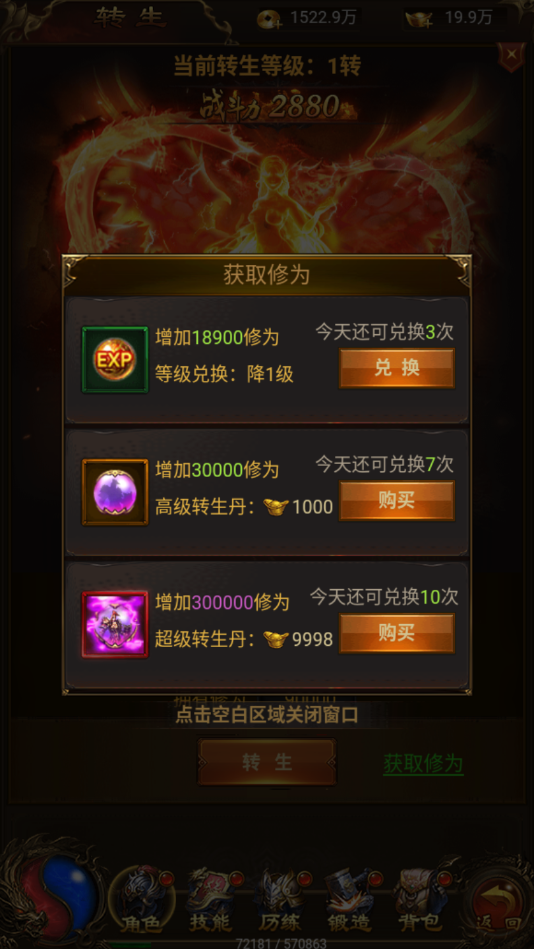 1、玩家的等级降低以及即可兑换一个“普通转生丹”,玩家自身的等级越高那么兑换的普通转生丹的转生值就会越多。