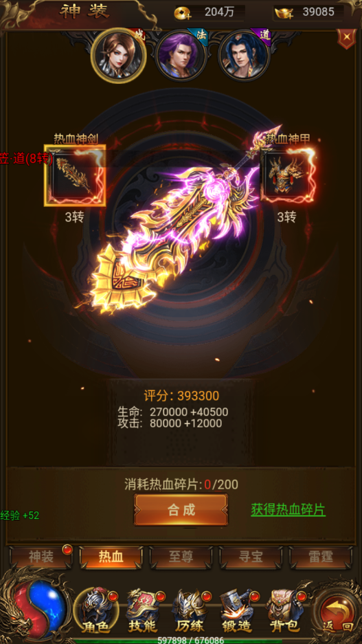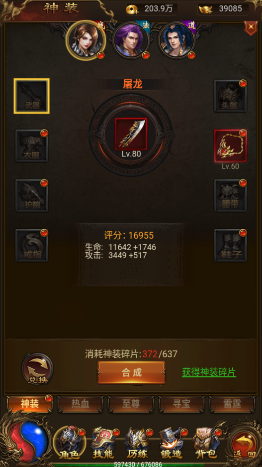 2、神装碎片可以通过挑战BOSS获取,玩家也可以通过分解神装的方式得到大量的神装碎片。合成和分解所需要和获得的神装碎片数量是一样的,大家可以尽情的合成分解。