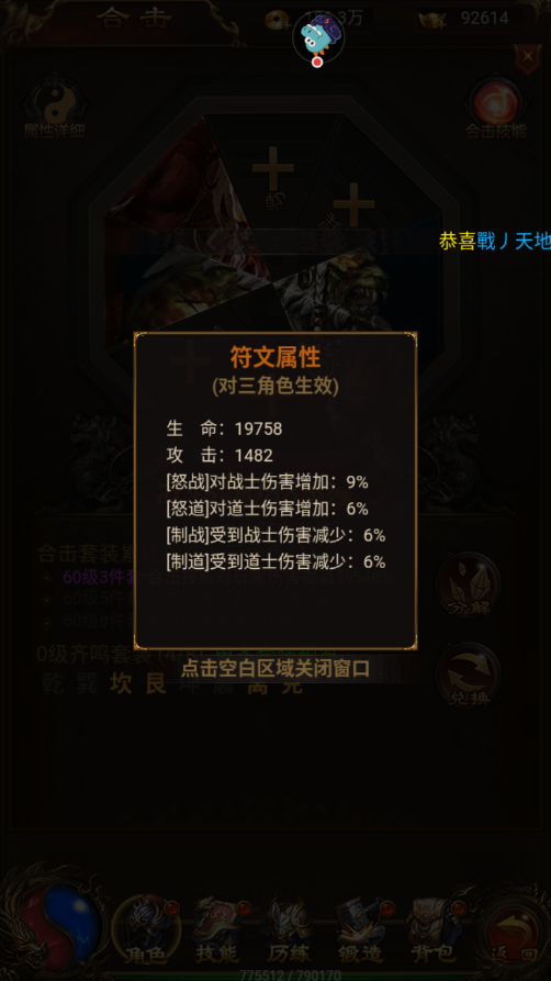 1、60转套装属性(三角色时):怒气回复速度+增加10%。