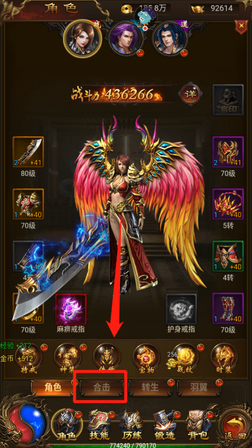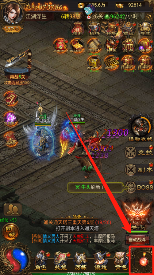 1、合击技能是游戏初始就有的能力,玩家可以选择手动点击右下角位置的红圈释放合击技能,也是可以选择自动释放的。