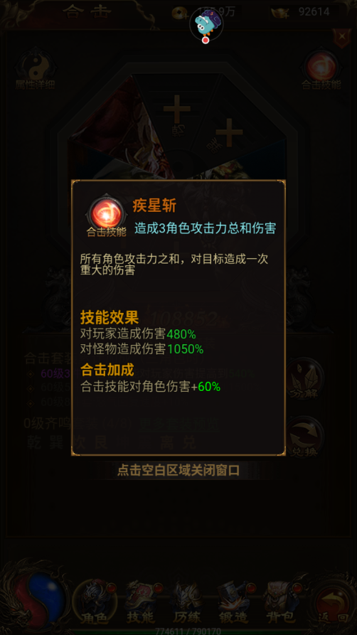 (2)技能效果:对玩家造成伤害480%、对物造成伤害1050%、合击能对角色伤害+60%。