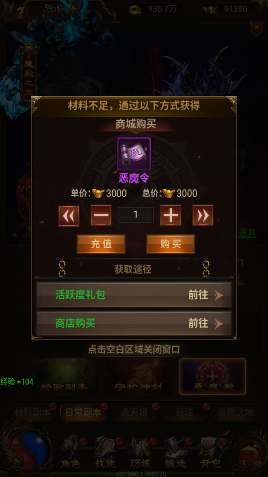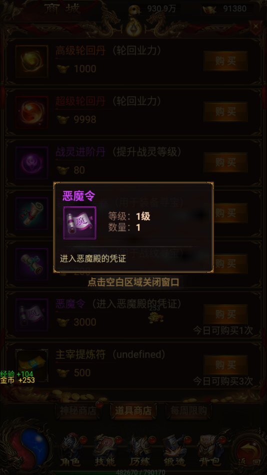 (2)商店购买:玩家也可以使用元宝在商店购买恶魔令,恶魔令的售价是3000元宝,并且每天只能购买一个。小编是不推荐大家直接使用元宝购买的,对于普通玩家来说消耗实在是太大,大家前期等级低还无法开启恶魔殿的时候就可以先积攒了恶魔令,等到六转之后就不会在缺少了。
