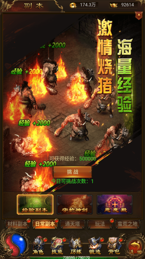 (5)经验副本:经验副本是专门获取经验值的地方,玩家自身等级越高,那么ton观后获取的经验值也就会越多。通关后玩家可以花费元宝来讲通关经验值进行翻倍,如果是VIP玩家那么可以购买额外的副本次数。