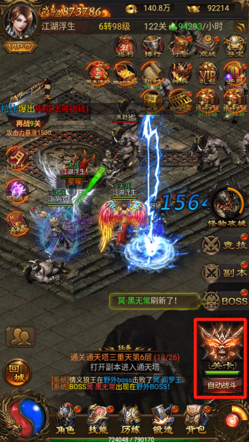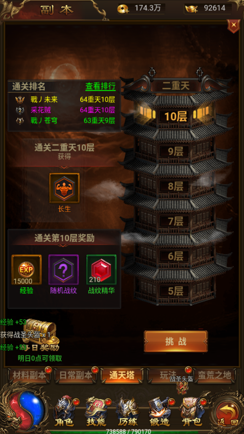 (4)通天塔:通天塔相当于一个副本,也和通关关卡类似,玩通关的通天塔层数越多,那么此次获得的经验值就会越多,前期升级基本都是在靠通关层数和通天塔。