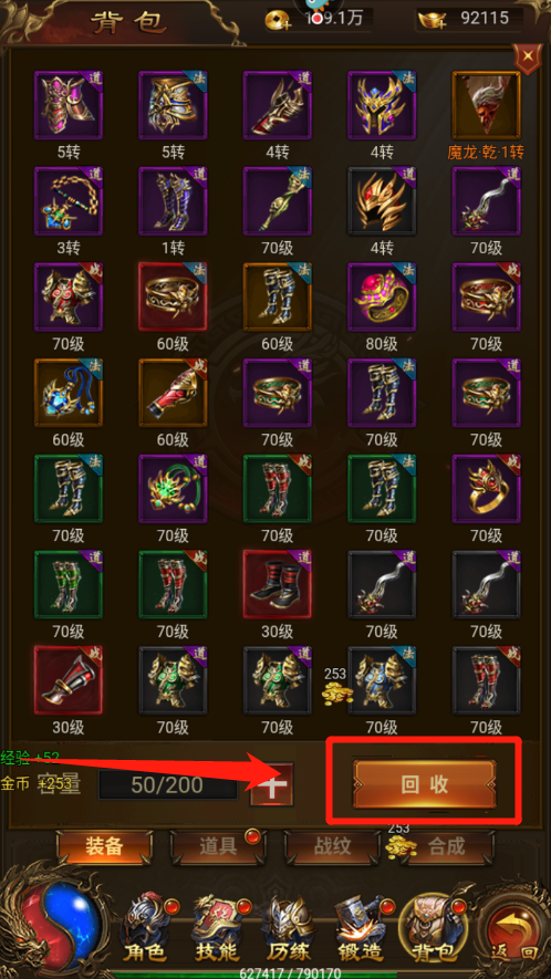 1、进入游戏的主页面点击右下角的“背包”按钮,然后点击下方位置的“回收”,确认回收之后即可分解没有用的装备。