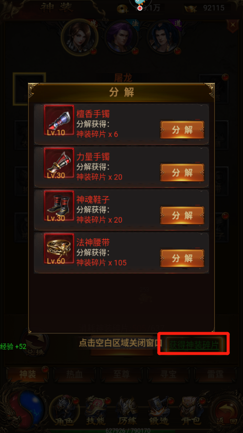 2、玩家需要注意的是神装无法通过这个方式分别,分解垃圾没有用的装备可以得到金币、强化道具、元宝、经验值。