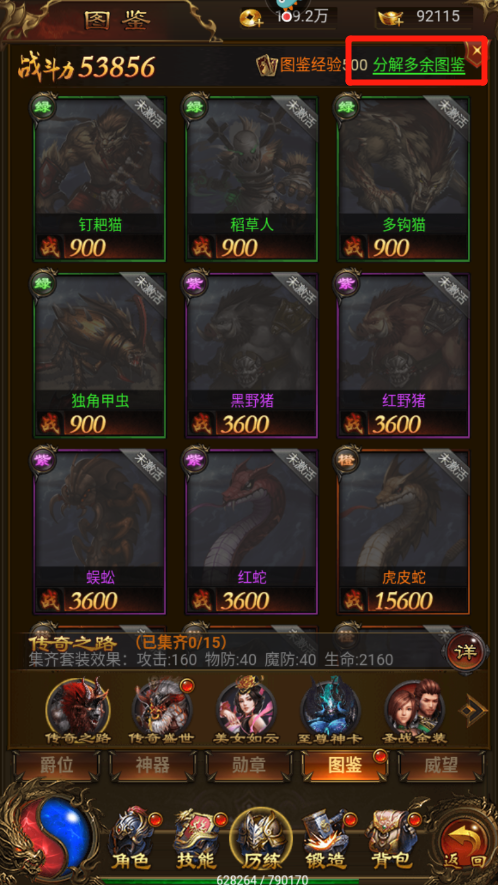 1、进入游戏的主页面点击右下角的“历练”按钮,然后点击下方位置的“图鉴”,图签的最上方有个“分解多余图鉴”按钮,点击即可分解垃圾图鉴。