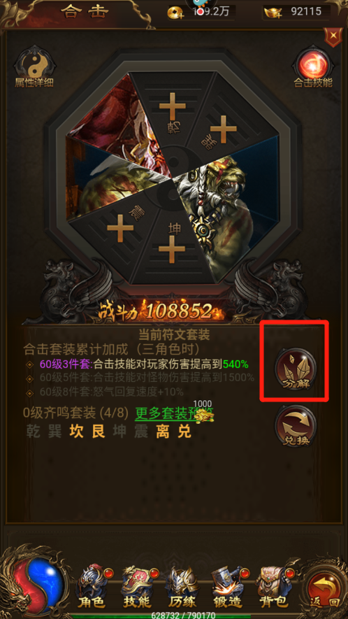1、进入游戏的主页面点击右下角的“角色”按钮,然后点击下方位置的“合击”,再点击右方位置的“分解”按钮即可分解没有用的符文。