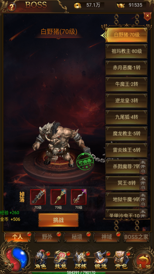 1、个人BOSS:击杀个人BOSS肯定能够获得神装碎片,每个阶段的个人BOSS在一天之内只能挑战一次,无法通过其他方式增加次数。