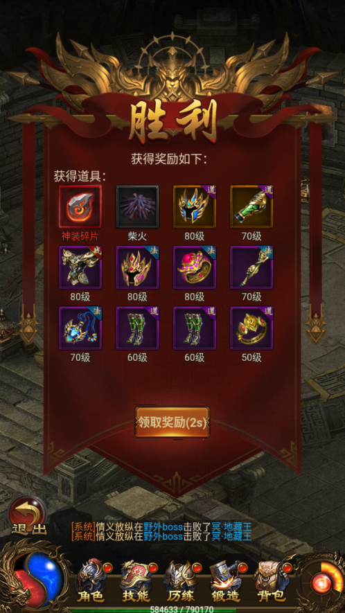 6、活动BOSS:活动BOSS分为怪物攻城和世界B0SS,这两个属于是全区一起击杀的BOSS,大家的伤害越高那么得到大量的神装碎片,还有几率直接得到神装。