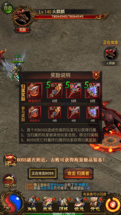 2、野外BOSS:每过两个小时会自动涨一次挑战机会,玩家击杀或者是参与击杀都能够得到神装碎片。