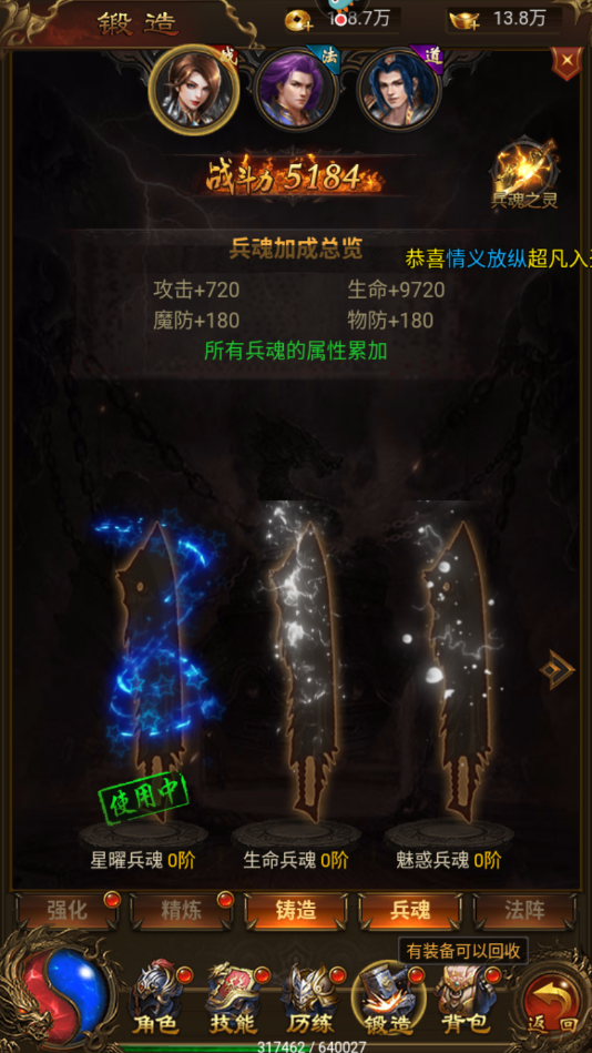 6、战纹:战纹相当于给角色镶嵌宝石,可以在通天塔副本得到碎片,强化之后分解是无消耗的,因此前期即使是紫色图腾,也可以先强化满级提升战斗力。