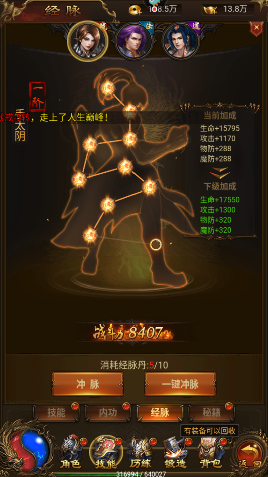 (3)经脉:经脉没有办法,不花钱的玩家只能慢慢通过活动或者是副本得到的经脉丹慢慢升级。